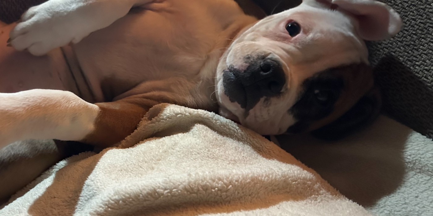 Weiß, rotbraun mit dunkles Mal am linken Auge. Rechts (weißes Fell) halb blaues/braunes Auge.